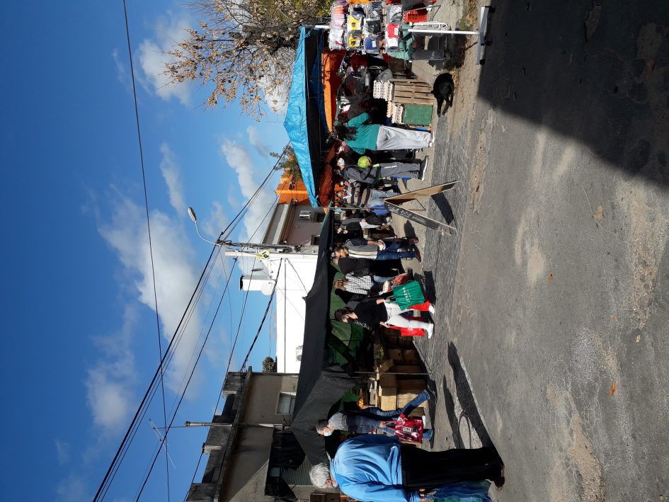 van algo más de sesenta, con verduras y frutas, algunos puestos de ropa, y